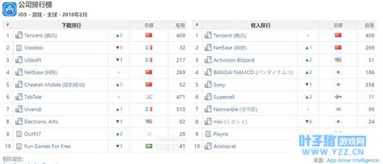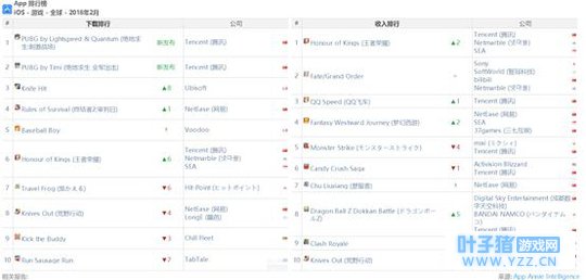 App Annie发布了2018年2月全球手游市场数据。自2018年1月滑落到全球IOS收入榜第三位后,2月份《王者荣耀》再度发力,重新夺回榜首位置。由腾讯天美工作室和光子工作室开发的《绝地求生全军出击》和《绝地求生刺激战场》首发后即霸占全球IOS下载榜前两位。