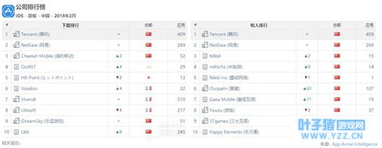 按公司排名,2018年2月,中国区IOS收入榜和下载榜前两位都是腾讯和网易,两家公司长期稳居国内游戏行业头部。除此之外,值得注意的是,bilibili在收入榜上仅次于腾讯和网易,排在第三位,同为二次元手游公司的米哈游紧随其后,可见二次元手游市场的火爆。