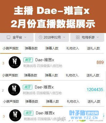 根据小葫芦数据统计,在2月份吃鸡手游主播排行榜单上,主播Dae-难言x小葫芦指数889,弹幕条数累计超过120万条,直播间弹幕活跃人数31.4万人,三项直播数据均位居全网同类型主播TOP3之列;除此之外,Dae-难言x的直播间订阅数已经超过40万人,人气峰值同样在40万左右,这仅仅是加入虎牙直播平台短短一个月时间的成就,成长速度之快让人惊叹。单从手游主播数据考量,主播Dae-难言x在短短一个月时间,就已经成长为手游吃鸡主播第一人。
