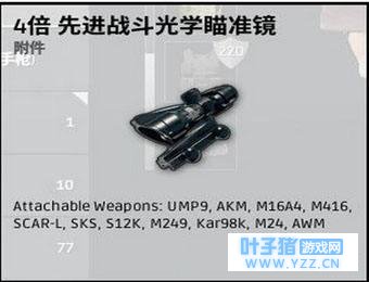 4倍镜。 在这里不推荐8倍镜,因为决赛圈敌人与你的距离本身就不是很远,8倍镜就显得很鸡肋,而且小编也试过8倍镜近距离攻击,感觉不是很好,所以选择4倍镜即可。