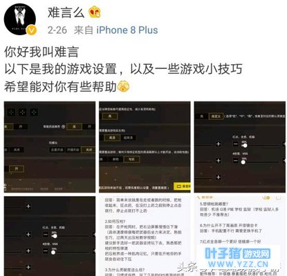 转战刺激战场后,游戏内更加人性化的设计给了难言更大的发挥空间,已经达到了场均10杀的地步。同时针对没有玩过端游绝地求生的玩家,难言细心地讲解游戏内枪械配件的作用,同时将自己常用的灵敏度和小技巧分享到微博上供玩家参考,不少人表示看了直播感觉自己技术都得到了提升。