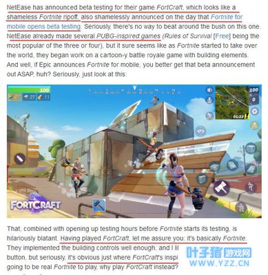 对此,国外的知名手游媒体TouchArcade,直接在3月12日发长文批评。下图是小编我的节选,主要内容我给大家翻译一下。 1.网易的手游堡垒前线和堡垒之夜十分相似。而且,抢先发行。 2.网易已经抄袭了绝地求生出吃鸡手游。 3.堡垒前线和堡垒之夜的画风很相似,附图。 4.编辑玩过堡垒前线之后可以很肯定这个游戏的基础就是堡垒之夜。而且,最本质的地方也是抄袭堡垒之夜的。 5.轻微说一下堡垒前线适合低端机。