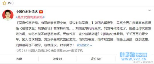 图片来源于网络 《战狼2》凭借高达56.8亿的票房让吴京钵满盆盈,至今吴京热度仍未下降。正所谓人红是非多,前不久刚代言的手游《刺激战场》就被某作家提议封杀。