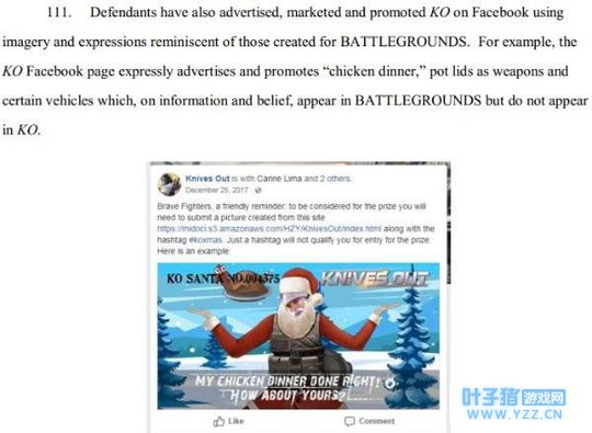 《绝地求生》的大热引来的众多后来者纷纷效仿,本次PUBG起诉网易的除了版权侵犯,还有不公平竞争和侵犯商业外观。在递交给加州联邦法院的诉状中,PUBG提到这两款手游发行于自家《绝地求生》正版手游之前,意图占领市场份额,为此,网易未经允许抄袭了PUBG的一些重要元素。 长达155页的诉状细数了两款游戏侵犯PUBG版权的各类元素,包括建筑,地标,载具,武器,装扮,素质广场和缩圈机制。比如其中一项提到,被告复制了PUBG对赛前准备区域的描述,其中包含有和PUBG一样游戏体验的描述。游戏还使用了PUBG的标志性的“大吉大利,今晚吃鸡”的标语,另外,两款游戏都在其宣传广告中使用了这一标语。