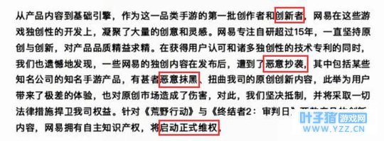 在回应中,网易声称自己的《荒野行动》和《终结者2:审判日》都拥有原创自研的游戏引擎。网易不断坚称自己是独创的创新者,不仅如此,网易还叫苦不迭声称自己才是受害者。《荒野行动》和《终结者2:审判日》遭到了恶意抄袭和恶意抹黑,网易将开启维权。