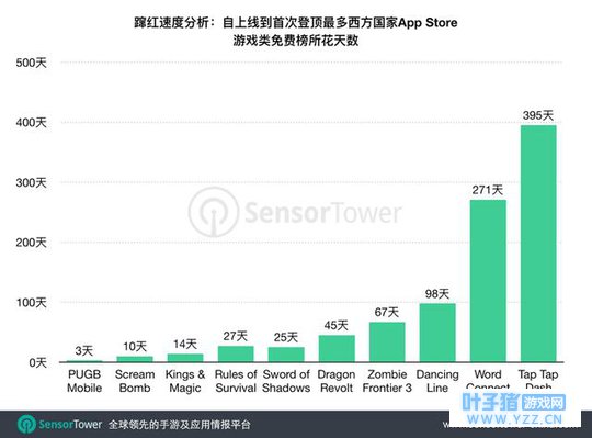 从以上榜单中可以观察到,除了领先的两款吃鸡手游以外,其余国产作品所登顶的西方国家App Store都在10个或以下。吃鸡类手游自2017年以来在西方市场的红热程度可见一斑,而其最初的热潮也是由亚军《Rules of Survival》的发行商网易于去年底先后在全国和全球掀起的。 若仅看各国App Store的手游类免费榜,《PUBG Mobile》登顶49个西方市场的佳绩仅次于任天堂在2016年底高调上线的《Super Mario Run》。《Super Mario Run》通过全球玩家熟知的经典IP,在去年一气呵成拿下了全部50个西方国家的App Store游戏类免费榜冠军。而《PUBG Mobile》唯一尚未登顶的是加勒比岛国巴巴多斯App Store;自上线以来,《PUBG Mobile》在巴巴多斯的免费榜排名一直次于《堡垒之夜》,截至目前的最好成绩是单日iPhone下载量亚军。 但如果我们进一步拓展分析的范围,观察包括游戏在内的所有App类别,并探索各国所有类别的App Store单日免费榜排名,《PUBG Mobile》则成为了去年以来全球登顶最多西方App Store的iPhone应用,一共曾在48个西方国家打败其他所有App的单日下载量。如此令人瞩目的成绩让《PUBG Mobile》击败了西方市场上如Bitmoji、Sarahah、及YouTube等一度红热的App,以及《堡垒之夜》、《Super Mario Run》、以及诸多Voodoo和Ketchapp旗下病毒式走红的休闲小游戏。 其余上榜的国产手游中,创智优品推出的文字类休闲游戏《Word Connect》排名季军,共登顶14个西方国家的App Store游戏类免费榜,去年七月甚至近一个月在其下载量最大的美国iOS市场保持单日免费榜排名前三的好成绩。其余TOP10的作品均登顶了10国以下的App Store。 | 《PUBG Mobile》为蹿红西方市场速度最快的国产手游 这些曾经走红西方市场的国产手游其实存在不同的发展节奏和步伐:从上线到登顶最多西方国家App Store免费榜的时长不同,能反映出各手游蹿红最多市场的速度大相径庭。