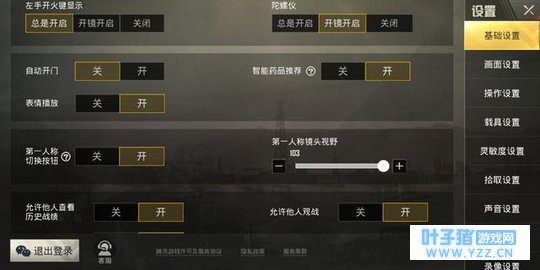 左手开火键显示 默认总是开启,便于瞄准中射击以及之后会提及的三指乃至于四指操作。 陀螺仪 是争论比较大的一个功能了,很多人表示不习惯,但不可否认的是 熟练掌握陀螺仪能让你的瞄准射击甚至于压枪更具有威胁性! M24君的建议是打开并多加练习。 自动开门 推荐关闭, 智能药品推荐 推荐打开,在生死攸关的时候或许能帮你争取那0.5秒左右的时间。 第一人称切换按钮 推荐打开,攻楼利器,因为第三人称跟第一人称打高处敌人时腰射的判定有差异,在楼梯打二楼敌人,同样的位置角度,准心瞄准腰射第三人称很容易打在楼梯上,而第一人称则不会。 【画面设置】