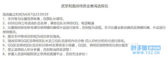 这次虎牙举办的刺激战场赏金赛有一点非常良心,那就是只要条件即可报名,这意味着只要你是吃鸡高手,就有机会在比赛中大显身手,并且还有希望获得TGA总决赛门票哦,当然提前是你有这个实力打进决赛!下图是此次虎牙刺激战场赏金赛的海选报名规则,看规则最基本的就是积分要达到,否则是无法参赛。
