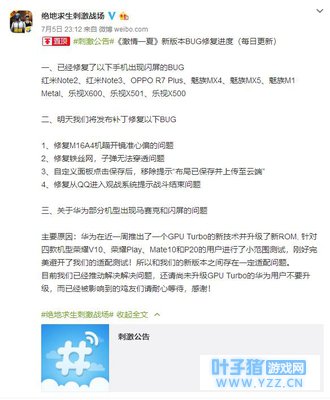 直至当天晚上11点左右,吃鸡手游官方才发布公告,表明已知悉此事,由于华为对旗下的部分手机引入了新的GPU Turbo功能,导致吃鸡手游并未适配,所以出现了花屏bug,并告知用户不要升级带有GPU Turbo的功能版本。