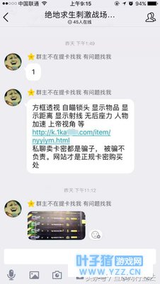 相比手游,行业云君一直觉得,外挂应该会少很多,或者比较相信腾讯对于外挂的治理,而就在今天,行业云君觉得这个想法太天真了。今天行业云君莫名的被游戏里的帮会拉入了一个“绝地求生刺激战场开黑”qq群,群里可谓是上来就直奔主题,卖挂卖的不亦乐乎。而且最近在刺激战场中遇到外挂的概率也越来越多,此时行业云君更为国服吃鸡感到担心,目前手游都是随处可见的吃鸡外挂宣传,甚至比当时端游还火爆,卖挂的现象更加恶劣,难道这次更新之后,官方对外挂的打击力度松懈了?