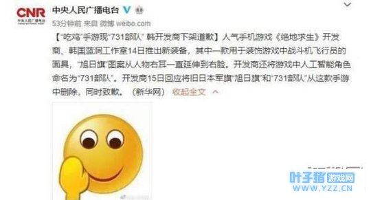 近吃鸡游戏非常的火,网上有很多的吃鸡手游,最近有些小伙伴在正版的吃鸡手游中发现了一群名字雷同的一批人,731,非常的菜,大家都在问这个731是怎么回事?小编就为大家详细的介绍下这个事情! 韩国手游事件经过上周六,PUBG公司在手机游戏中发布了一个试验性的面具活动,同时游戏中加入的智能(AI)游戏机器人使用了“731部队”这样的代号。这些装备和代号一经曝光就引起了许多韩国游戏玩家的争议,他们认为这“太阳旗”是第二次世界大战期间日本帝国主义的标志,是对包括朝鲜、中国在内入侵战争罪行的象征。731部队则是臭名昭的日本化学武器、生物武器研究部对的代号,此部队对中国及周边各国人民都犯下的暴行罄竹难书。