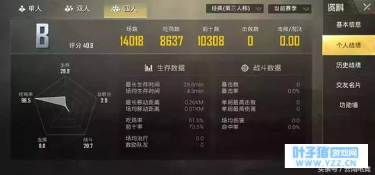 场数14018,是不是很夸张?再看吃鸡数更是夸张到8637!前十数呢,竟然都上万了!0击败和KD0,可以看出是一位“伏地魔”,场均4.3分钟也说不了什么,毕竟一万多局.... 当然,这一组数据有玩家认为:这组数据只有两种可能! 其一是P图; 其二嘛,这是此前用过外挂,被封号处理了,所以不显示击败数和KD值~事实上 再看我们这位玩家的段位!