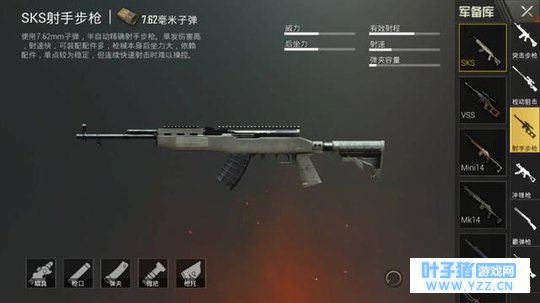 5,说完了常见的突击步枪,再来说说射手步枪,也就是常说的连狙,亦称作半自动狙击步枪。SKS这把枪后坐力很大,而且配件有时很难凑齐,一般玩家不会使用,而且后坐力和伤害都不算突出,不推荐使用。