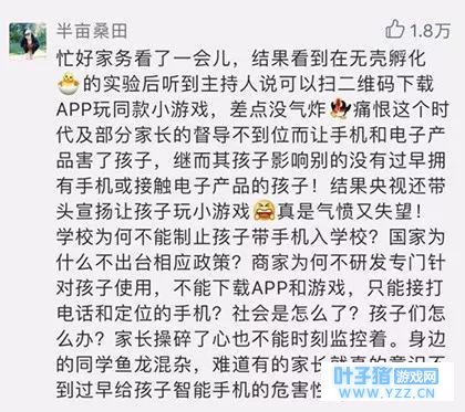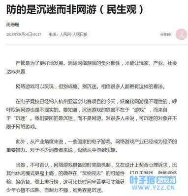 “孩子沉迷游戏”,错的是“沉迷”还是“游戏”? 人民日报的这篇文章给了我们答案! 在老一辈人普遍存在的观念中,打网游就等于玩物丧志。他们异常的抵制网游,甚至将网游妖魔化,比作万恶之源。也因此只要发生的事件与游戏相关,就将一切的过错都归结于游戏身上。 13岁男孩的妈妈将所有过错都算到吃鸡手游头上就是这个原因。虽然大家和身边朋友对这个事件的评论风向都是一边倒,但这是因为身边人都是游戏圈里人的原因,可能大家对圈外人看待游戏的态度并不清楚,三眠给大家举两个例子让大家有直观的体验。 第一个 :近段时间是开学季,央视有一个叫 《开学第一课》 的节目。其中有一段是 介绍无壳孵化小鸡的实验 ,在实验结束后主持人说可以 扫描二维码下载同名app玩这款寓教于乐的小游戏 。在节目结束后,三眠在朋友圈刷到的 相关热点文章 下面看到了一条这样的评论。