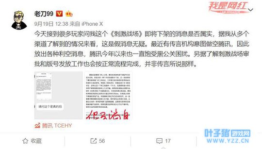 随后,文章中还指出为了避免刺激战场和全军出击下架造成损失,腾讯已经在秘密研发新的吃鸡手游,以求替代这两款产品。不得不说,这则谣言对于所有喜爱吃鸡游戏的玩家来说,还是产生了巨大的影响。毕竟还有不少玩家在迫切期待绝地求生国服的上线,而且对于刺激战场和全军突击的玩家来说,这也将产生巨大的影响。 不过值得庆幸的是,在这条谣言发布之后,官方第一时间站出来辟谣。腾讯表示这条资讯纯属谣言,毫无任何根据,广大吃鸡玩家不必担心。值得一提的是,游戏圈内著名大V"老刀99"同样也是第一时间站出来辟谣,并且补充到刺激战场的审批和版号发放工作会按照正常流程完成,所以不用担心。
