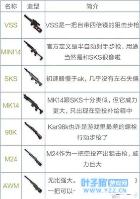 狙击枪排名: 1、AWM-空投必捡,不管你一二三级头,一枪放倒没商量。 2、M24-同样的空投必捡狙击,威力巨大各方面性能优于98K。除了三级头以外都可以一枪爆头。 3、98K-常见的狙击枪,获取难度低,威力仅次于前两把空投。值得一提的是8倍镜是前三者最佳配置,4倍镜更适合于半自动狙击步枪。因为前三把拉栓狙击步枪最大的意义,就是一枪爆头。如果没有爆头那么步枪跟上补枪是最好的选择。 4、SKS-半自动步枪中的佼佼者,四个配件满配的话,可操作性好于98K,毕竟除了新手,没有多少玩家会站着不动,给你瞄头的。垂直握把是sks的最好选择。 5、mini14-sks的替补选择,说实话选择它,还不如选择M16,切换成单发,比不满配的sks好用。因为后坐力小,准确度高。 其余狙击枪不做排名,没卵用可以忽视。 开局跳伞,很少会落地捡到步枪,所以冲锋枪是最好的钢枪选择。