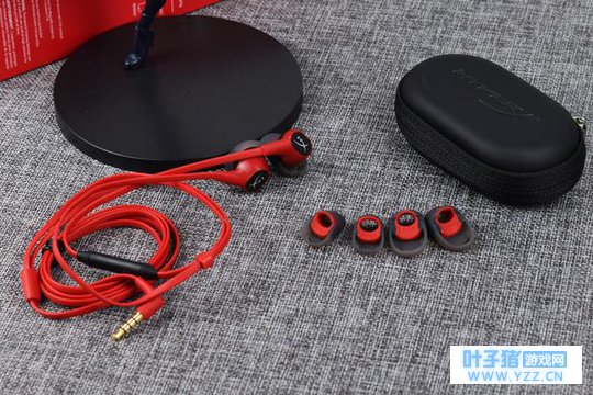 全套附件 在附件方面,金士顿HyperX云雀除了耳机本体外,还包含了三对专用耳套,一个收纳包,以及箱说和HpyerX相关介绍,可以说该有的都有了。 产品细节相对于其他金士顿游戏耳机的黑色基调,云雀采用了红色为主色调,耳塞腔体部分使用倾斜导管设计,这种腔体设计有利于耳机使用较大单元,这也是云雀使用13mm单元但体积并不巨大的原因,而另外一个特色则采用人体工学设计耳套,不仅改善长时间佩戴舒适度,还有防掉落效果。