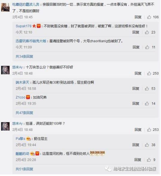 在此前XZ战队参加《绝地求生》香蕉国际邀请赛时,星魂就曾被网友质疑在比赛中使用了外挂,虽然官方把XZ战队的比赛录像和选手账号回收调查,但随后这一事件也不了了之,但此前早已有NGA网友在网上爆出过星魂账号被封的情况。讽刺的是,该主播曾公然叫嚣称“实锤开挂奖励十万人民币”,而这次被官方封号100年也遭到大量网友调侃。