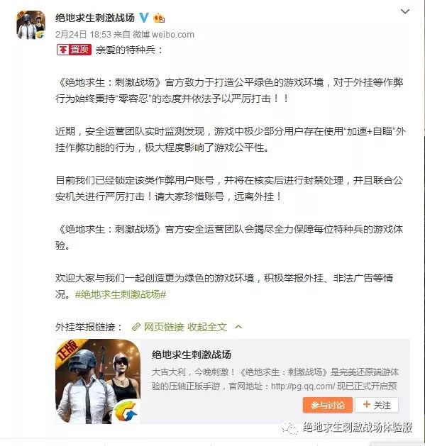 官方表示,目前已经锁定该类作弊用户账号,并将在核实后进行封禁处理,并且联合公安机关进行严厉打击!请大家珍惜账号,远离外挂! 《绝地求生:刺激战场》官方安全运营团队会竭尽全力保障每位特种兵的游戏体验。 对于大家期待的“死亡回放”功能,官方也有回复,称已反馈给项目组,相信不久后就会与大家见面。