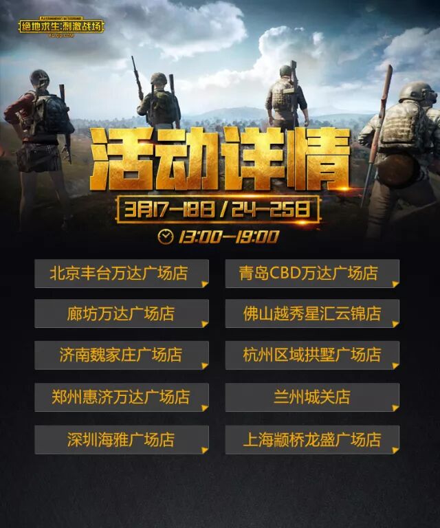 活动将在北京丰台万达广场店、青岛CBD万达广场店、廊坊万达广场店、佛山越秀星汇云锦店、济南魏家庄广场店、杭州区域拱墅广场店、郑州惠济万达广场店、兰州城关店、深圳海雅广场店以及上海颛桥龙盛广场店举行。参与即可获取各类奖励,快拉上好友来万达影院吃鸡赢大奖吧!