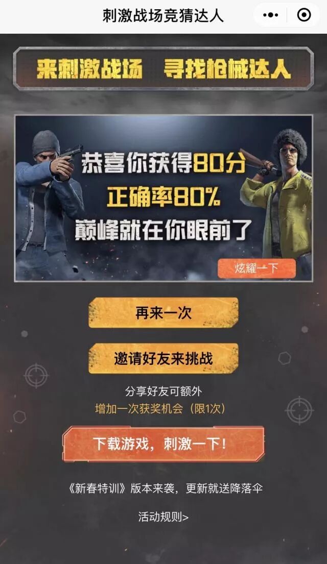 03 查看分数 五题回答完毕,即会自动算分查看自己是否是真正分枪械达人,点击【邀请好友来挑战】还可增加获奖机会一次。