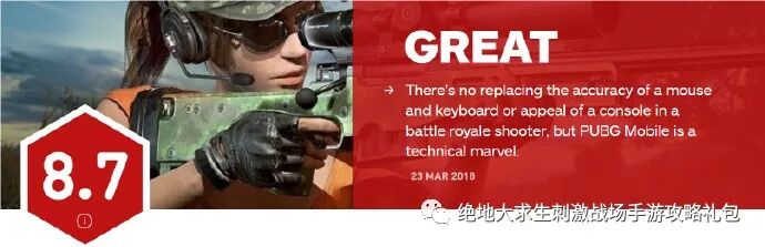 全球规模最大的游戏娱乐媒体IGN(Imagine Games Network)是一间多媒体和评论网站,在对《PUBG Mobile》的评价者给出了8.7的高分评价。 《绝地求生:刺激战场》将一款原本配置要求就很高的PC/主机游戏成功搬到了手机平台上,而且功能齐全、运行平稳,值得夸奖。触摸操作有时不太好用,而且永远不会像键鼠/手柄那样精确,但手游版便携、易得(免费)的优点更加突出。
