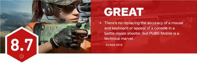 IGN给《绝地求生:刺激战场》打了8.7分,并称其“令人耳目一新”,主要评语如下: