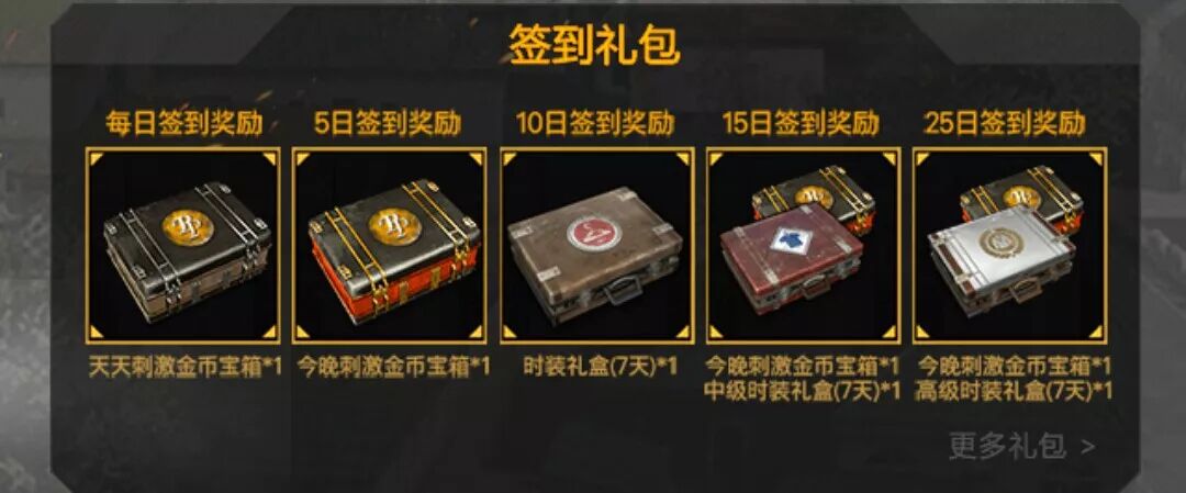 1、 每日签到 奖励 :天天刺激金币宝箱一份 2、 5日签到 奖励 :今晚刺激金币宝箱一份 3、 10日签到 奖励:时装礼盒(7天)一份 4、 15日签到 奖励:今晚刺激金币宝箱一份+中级时装礼盒(7天)一份 5、 25日签到 奖励:今晚刺激金币宝箱一份+高级时装礼盒(7天)一份
