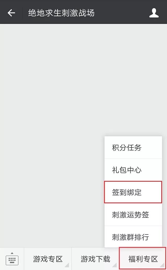 1、进入绝地求生刺激战场 公众号 之后,点击下排菜单栏【福利专区】, 再点击进入【签到绑定】: