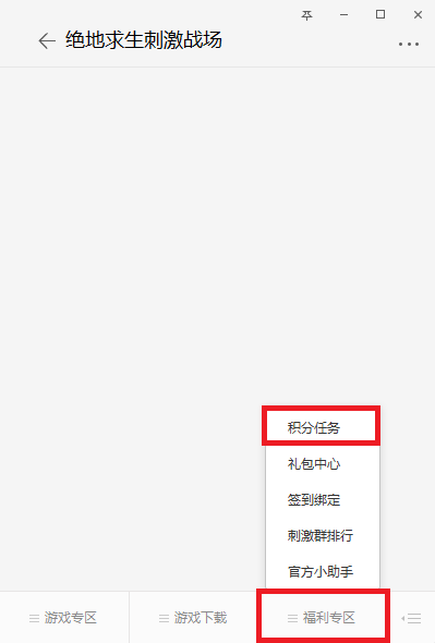 1、进入绝地求生:刺激战场公众号,点击【福利专区】进入【积分任务】: