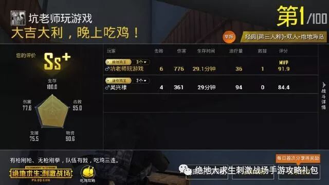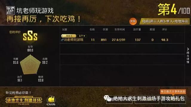 坑老师每次的评分都是三个S,象征着坑老师的水平66哒,这次没吃到鸡是因为位置选择错误,这是一个错误的示范,下面再开一局,正确示范一下如何伏地魔吃鸡。