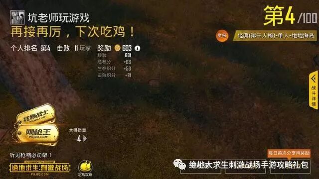 这一次坑老师选择的伏地位置不是很好,被对面山上的98K瞄到的,一枪爆头,坑老师只是拿到了第四名,可惜了杀了11个人,不知道这个战绩在吃鸡界是什么水平?