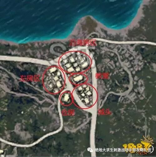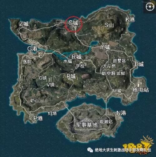 板块划分是为了更好和队友沟通报点,我们将S城分为: 三个大板块:城头(最下方的房区)左房区(城最左边的房区)沿海房区(最上方的建筑群) 两个小点:教堂和仓房 跳伞落点 推荐跳城镇外围建筑从外向内搜以免四处受敌,不建议一开始跳教堂,因为教堂资源不稳定,硕大的窗户将你暴露在敌人的视线内无处可藏。 城头和仓房地形开阔视野明了,不容易被敌人阴,但是我们需要蛇皮走位边跑边跳,躲避敌人的子弹。 沿海地区的房子排列紧密地形复杂,需要谨慎搜索,发现敌情立马寻找掩体而不是去找敌人在那里进行反打。