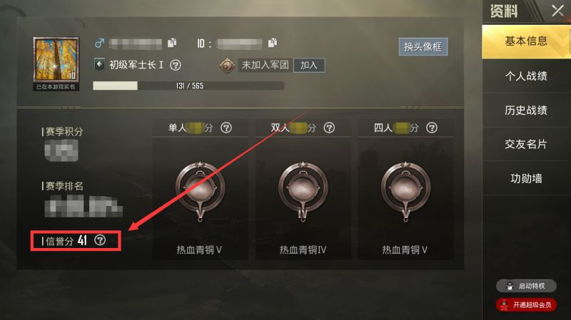 一、信誉分可进入 玩家个人资料 (主界面点一下自己的头像)进行查看。