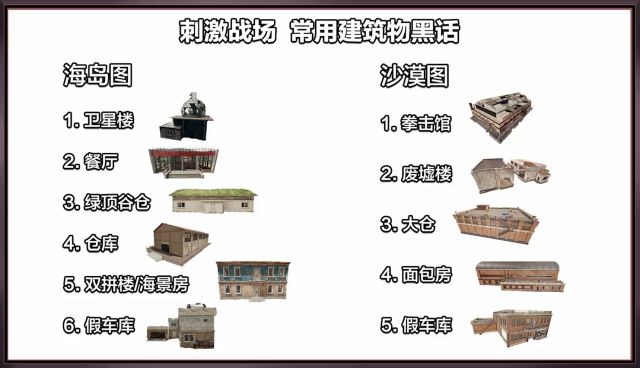 当来到城镇中巷战时,建筑就成了我们报点的最佳参照了,一起来看看刺激战场上(海岛图和沙漠图)的建筑都叫什么名字。