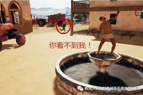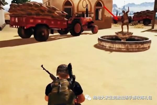 在那局游戏里,玩家是玩的沙漠地图,他在降落的时候就选择了避开大城市跳向野区搜索装备,可是不幸运的是同时有几个人也跳向了他所在的野区,而且落地的时候他捡到的是手雷而旁边敌人先手捡到了枪,玩家眼看对方已经捡起了M4,然后撒腿就跑,后面的拿着枪的敌人当然也是穷追不舍,就在这个时候拿着手雷慌得一笔的玩家发现了他身旁有一个喷泉水池,他灵机一动就跳到上面去做出手抛雷的姿势!