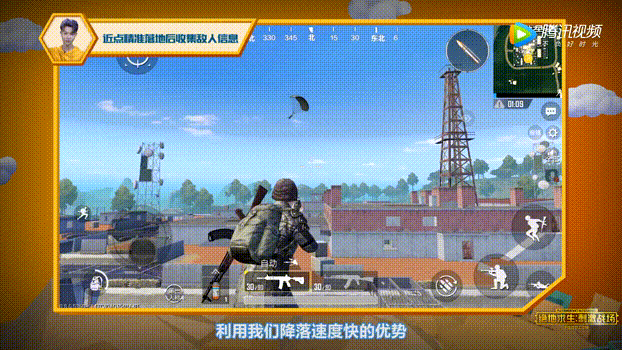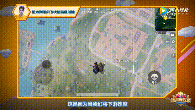 当我们在近点迅速俯冲落地时,为了 精准 地落在标记点上,我们需要时刻 调整 自己的 落地姿势 。利用我们 降落快 的优势,收集附近敌人信息。