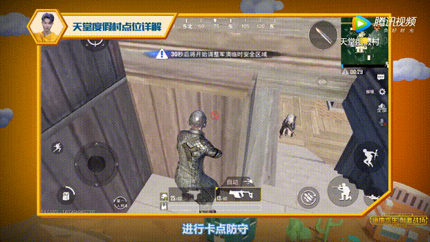 天堂度假村,推荐的地点在 地图右侧的小阳台 ,原因有以下五点: 1.视野覆盖天堂度假村 中心区域 ; 2.敌人只有 一条 进攻路线;