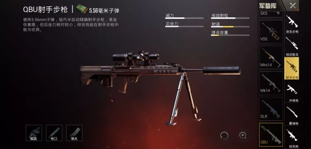 枪械点评 :QBU是5.56口径、无托设计的精确射手步枪,QBU最大的特点就是可以跟M249一样,伏地时可以将支架展开,射击时会显著减少后坐力。纵观所以连狙,目前刺激战场武器库中只有空投MK14拥有脚架,何况MK14还只能在空投中低几率出现。超远的攻击射程,配合双脚架完美减少后坐力,中远距离点射伏击是最佳的作战方式,不过在狙击枪中,QBU的威力是不占优势的,但是其连续作战能力,弥补了这一缺陷!