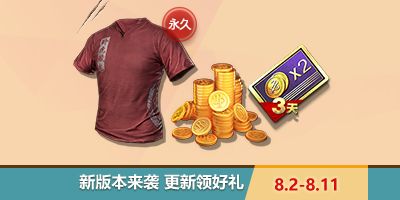 活动时间: 8月2日10:00-8月11日23:59 鸡友们只要更新到新版本,即送红色 卧虎藏龙T恤 (永久)、 双倍金币卡 (3天)、 3888金币 ,还不快快更新领取大礼包!