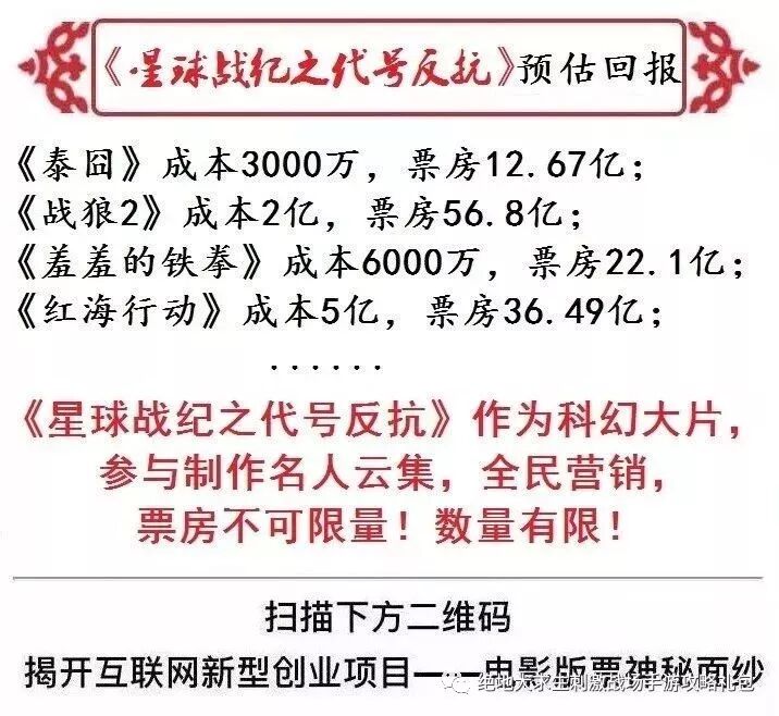 为了响应电影行业全民参与化的趋势号召,《星球战纪之代号反抗》片方分出一部分版权分给普通百姓,以便电影爱好者参与自己看好的电影,并且从中获益,同时版权参与者还可获赠电影官方门票。
