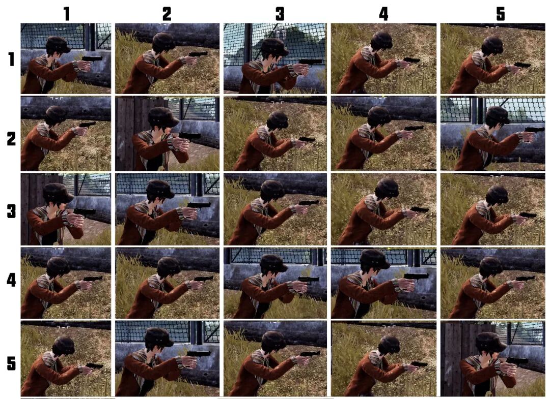这25张图中,我们有且只有 一张图 人物手里拿着的是 P18C ,请你找出它在哪里?如果 你认为 第一列第二行 是正确答案,留言 (1,2) 即可。