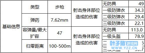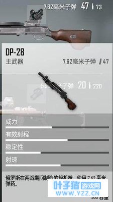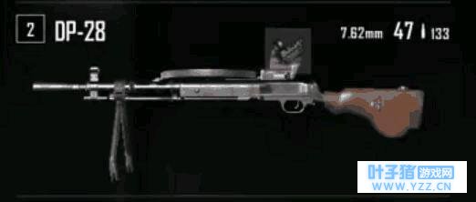 DP-28使用7.62mm子弹,每个弹夹配备47发子弹,配件只有瞄具,可红点、全息、二倍镜以及四倍镜,提升空间有限。虽然射速慢,但伤害高、有效伤害距离也远,全地图刷新可得,算是低配版的M249。