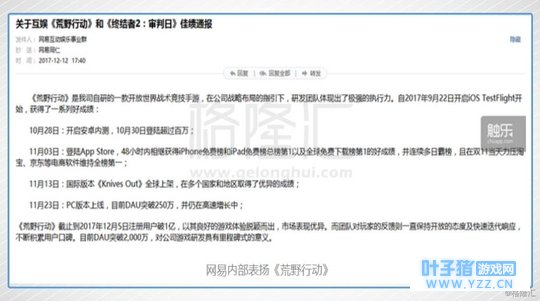 网易在两款游戏上线后,更是内部通报表扬:两款“吃鸡”手游干的漂亮!