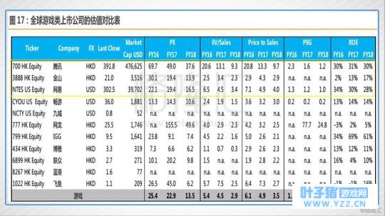 严选则迎合了新一代消费人群注重品质、淡化品牌的趋势,也实现了快速增长。本季度增加电器品类,由原先的9大品类拓展到10个,SKU从季初7,000个增长到超10,000个。2017年10月,严选MAU57万,日均使用时长13-15分钟,品类的逐渐丰富对消费者的吸引力增加。 如果,网易考拉和严选接下来能够保持这种态势,后面大概率能够凭借着中国新中产消费升级和消费降级的趋势,再上一波浪潮之巅,这会离再造一个网易又进了一步! 四、网易有多便宜?由于网易现在的主营业务还是游戏,我们来和同类的游戏公司比一比,下图中腾讯的估值是49倍的PE,盈收不到网易零头的金山的估值是19倍的PE,而网易的PE也只有19倍左右。和游戏行业平均估值22倍的估值比起来也偏低。如果进一步了解游戏行业的低水平估值,则会进一步发现网易的魅力!