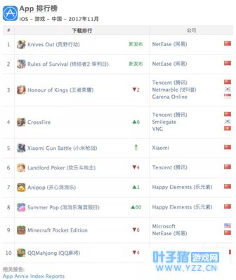 网易在推出《荒野行动》后获得了不错的反响。当前用户注册量已经达到1亿之多。而自家的另一款手游《终结者2:审判日》也有着不错的成绩。在App Annie发布11月手游指数报告中,《荒野行动》登顶下载榜榜首。《终结者2:审判日》位居第二。腾讯前段时间的吃鸡游戏六连发中的《穿越火线》(加入了荒岛特训模式 即吃鸡模式)也进入了下载榜第四名,《小米枪战》则屈居第五名。《小米枪战》有种给人昙花一现的感。
