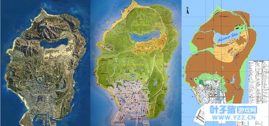 从左至右分别为:GTA5中洛杉矶的卫星图,GTA5中的游戏地图,现实中的洛杉矶地图。可以看出GTA5对于洛杉矶的还原还是相当到位的