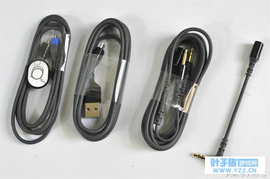 配件里的四根线,依次是耳机延长线、USB充电线、电脑延长线、3.5mm转接线;