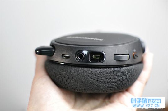 左侧耳罩边缘接口展示,分别是麦克风、充电孔、3.5mm耳机孔、USB耳机孔、音量调节滚轮和麦克风开关,常用的两个耳机孔特地做了下凹处理,交互上由于边框有一定的厚度,盲操是没有压力的。