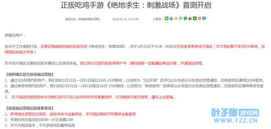 1月31日,刺激战场官方团队发布了资讯公告,表示1月31日下午18:00将正式开启安卓系统技术测试,同时就抽取资格的具体途径(“QQ手游”和“微信游戏”)进行了具体阐释,可以说是非常清楚明了。当然了,本次内测账号同样是要绑定设备登录,且游戏开放时间为每日18:00——次日凌晨1:00。惊喜的是,1月31日与2月1日,玩家都会有机会获得资格~